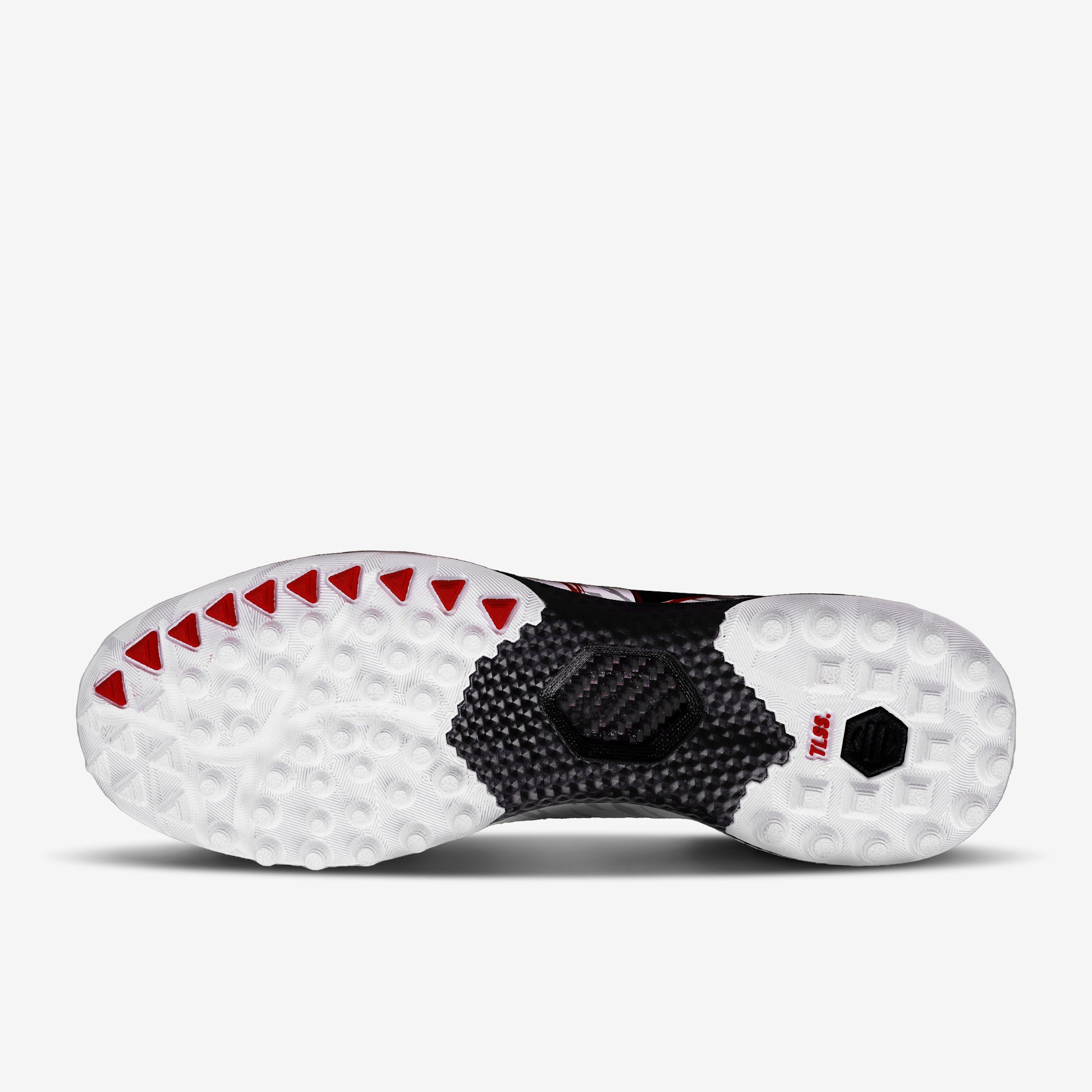Two-piece RB rubber outsole reduces weight. Toe cap overlap stitching prevents leather separation. Cross-stud forefoot pattern enhances grip, with rounded lateral studs for agile pivoting.